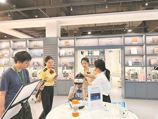 科技体验区内还设有VR眼镜体验项目,读者可以头戴VR眼镜、拿起手柄,进入虚拟的科幻世界。“我们的VR设备中装载了传统文化、少儿科普、体育运动等内容,读者可以通过VR眼镜进行沉浸式体验。”据陈梓华介绍,读者到馆使用VR设备无需预约,每次限时20分钟,也可办理借还手续将VR设备借回家。