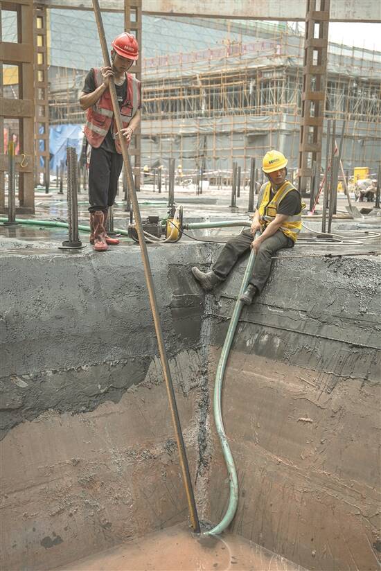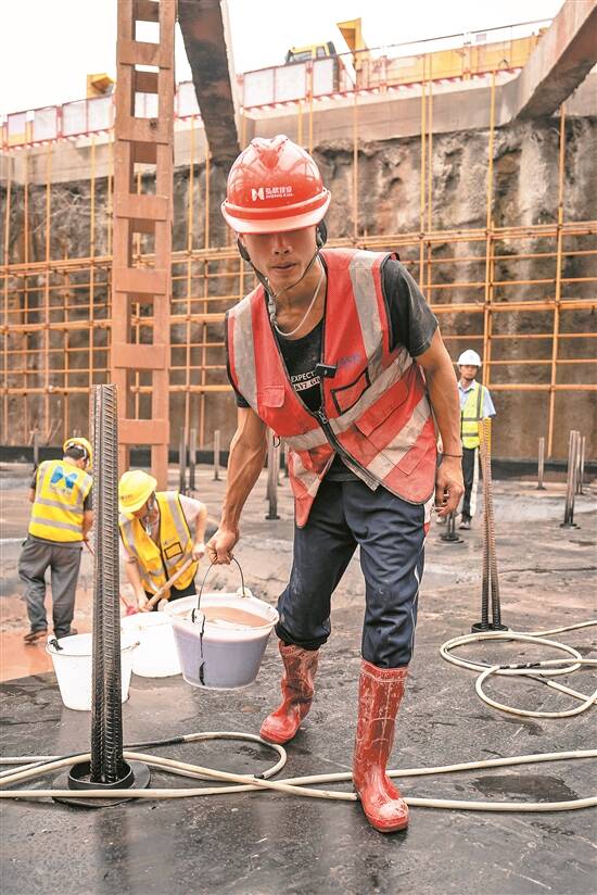 前几次白班,凯腾跟着师傅学会了修电箱、修水泵,“都只学会了半桶水,师傅都完成这边的工作,去别的工地了。”这几天,广州连日的暴雨让没来得及刷防水材料的基坑填满了水,凯腾负责抽水的后勤工作。工人加班加点地抽水,他也加班加点地在旁边帮忙。与之前的想象不同,凯腾感受到的是夜班和白班交替带来的精神上的疲劳,身体上的劳累也让他印象深刻,“有一次就是去铲泥巴,累得腰酸背痛,我一把铲丢下去,感觉我整个手都飘起来了。”凯腾回忆道。