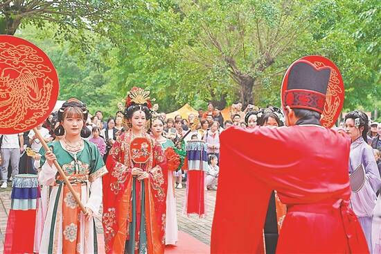 近期阴雨绵绵,但游客们观看汉服婚礼表演的热情高涨,迎新妇、却扇礼、同牢礼……中华传统汉服婚礼演出伴随着“礼成”落下帷幕。