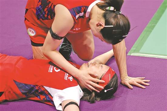 比赛过程也如意料中激烈,双方各胜一局后,日本组合在决胜局以18比12领先。但陈清晨在关键时刻的表现,扭转了整场比赛的局势。额头扎着一圈红色发带的她祭出一次次密不透风的防守、势大力沉的扣杀,一次次发出怒吼,一次次振臂高呼,点燃了全场的气氛,也镇住了日本组合的气势。在连扳六分后,“凡尘”以23比21拿下这场艰苦的较量。当最后一球落下,陈清晨久久躺在场地上,眼泪止不住地流。