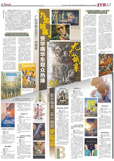 据猫眼专业版数据,截至5月5日21:51,2024年五一档总票房突破15.23亿元,超2023年五一档票房成绩,进入中国影史五一档票房榜前三名。五一档观影总人次3769.2万,总场次240.4万场,平均票价40.4元,总场次刷新影史纪录。冠军为动作片《维和防暴队》,档期票房4.05亿元;第二名为喜剧片《末路狂花钱》,档期票房3.90亿元;第三名为动作片《九龙城寨之围城》,档期票房2.53亿元。广东继续发挥全国第一票仓优势,在五一档收获超2.16亿元,票房领先全国。