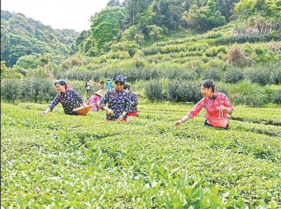 清晨六点,茶农们出发上茶山,携带着竹篓,敏捷地穿梭于山间,三五成群地围绕着一棵棵茶树,手指如同跳跃的音符,一捏一掐间,嫩绿的茶叶被熟练地摘取,绘制出一幅生动的春日采茶图。“我们是清明前一个星期开摘到现在的。”茶农林振东笑着介绍,作为茶叶大户,他家种了有300亩,每年的茶叶基本售空,“现在是采摘茶叶的最佳时期,正好趁着晴好天气采摘,熟练好手一天最多可以摘近30斤茶青。”