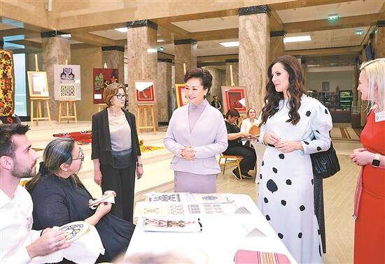 两国元首夫人共同观看了塞尔维亚妇女手工编织等传统技艺展示,并同她们亲切交流。彭丽媛表示,塞尔维亚手工编织技艺精湛、别具特色,是重要的非物质文化遗产,得到了很好的传承和发扬。中塞两国的刺绣文化具有相似性,双方可以加强交流互鉴,鼓励两国年轻人积极参与其中,推动传统手工技艺代代相传。两国元首夫人还饶有兴致地尝试塞尔维亚毛毡球制作,现场气氛友好热烈。