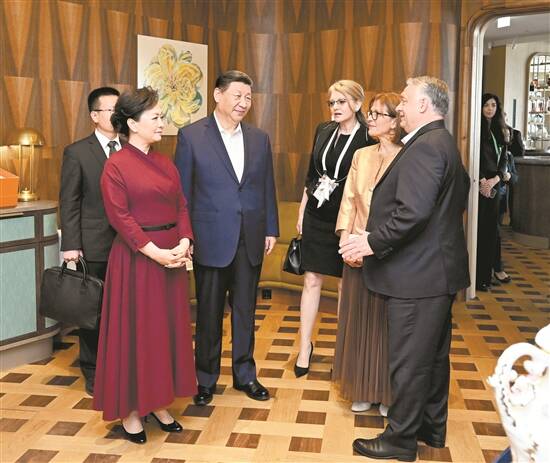 当地时间5月10日中午,国家主席习近平和夫人彭丽媛在布达佩斯应邀出席匈牙利总理欧尔班和夫人举行的饯行活动 新华社发
