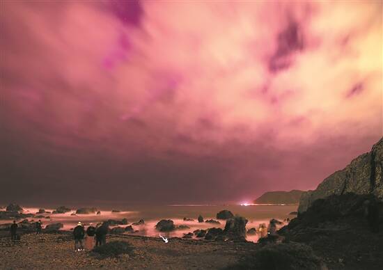 这是11日晚在新西兰首都惠灵顿南郊海岸线拍摄的极光 新华社发