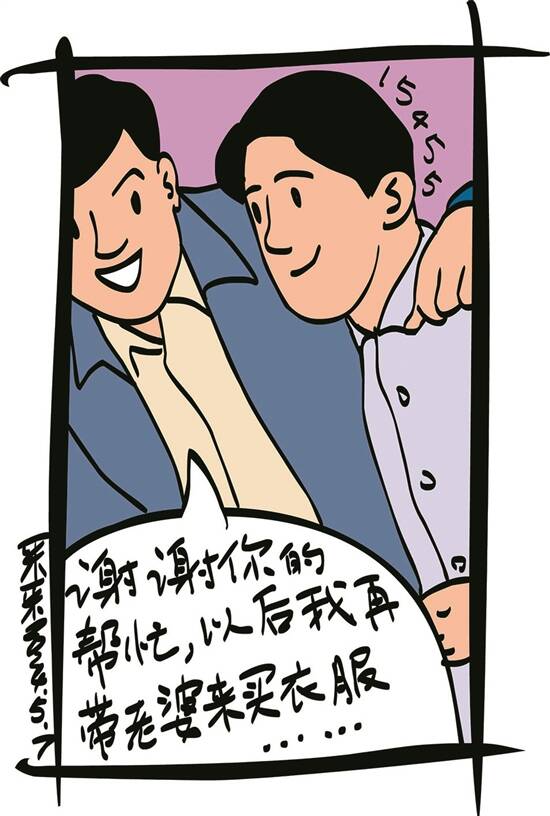 阿明笑着说:“老同学,恭喜新店开张啊!谢谢你的帮忙,以后我再带老婆来买衣服,你可以把价格再虚报高一点,再狠一点,让我假装讨价还价,多点砍价的空间,多赚点买彩票的经费。” (黄超鹏)