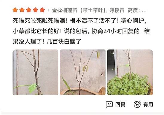 “因为榴莲比较贵,想买棵榴莲树希望能自给自足,买过两次光棍假苗,结果第3次在这买的还是假的,叶子长出来是圆的,很快也死了……”有网友在另外一家销售榴莲苗店铺里如是评价。