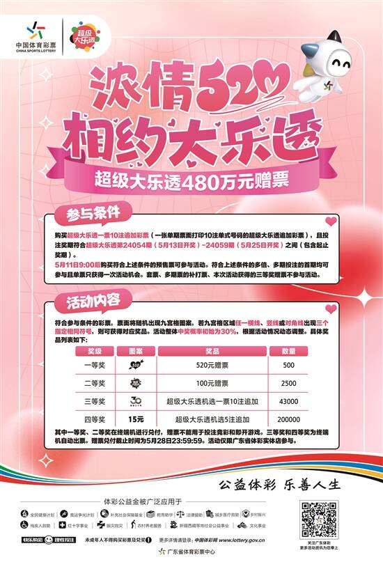 “520”将至,记者从广东体彩获悉,广东体彩举行的“浓情520 相约大乐透 超级大乐透480万元赠票”活动将为购彩者们带来大奖。近一段时间,购买符合一定条件的彩票的购彩者可参与活动。