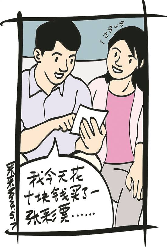 这天晚上,晓明对王梅说:“告诉你一件事。”王梅问:“什么事?”晓明从口袋了掏出一张彩票说:“我今天花10元买了一张彩票。”王梅听后说:“你怎么想起买彩票了?”晓明说:“我想买彩票碰碰运气,哪天能中大奖,好让咱俩的日子过得更好一点。” (汪小弟)