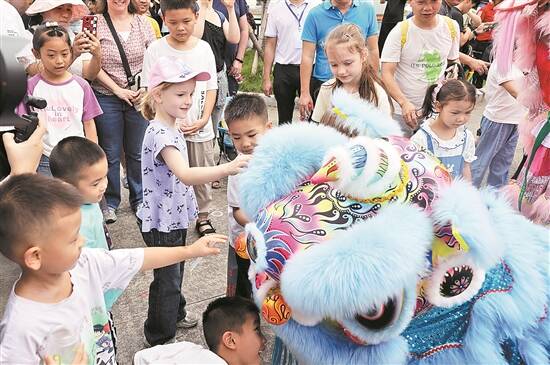 巡游仪式上,小朋友与舞狮互动