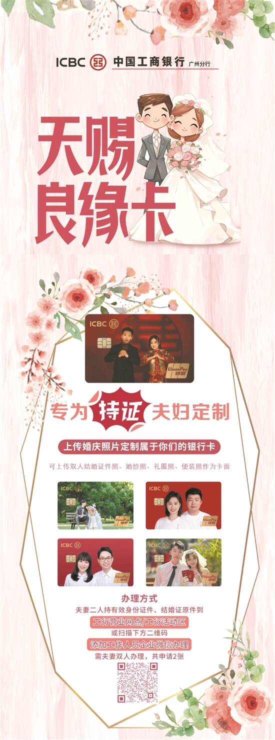 据工商银行广州分行介绍,近日该行在婚姻登记处、营业网点、线上等多渠道开展婚庆主题活动,通过数字化运营优化资源配置,精准匹配客户需求,为新人客户提供个性化、沉浸式的婚庆服务体验。其中,专为持证夫妇推出的“天赐良缘卡”定制借记卡最受关注。该卡可上传双人结婚证件照、婚纱照、礼服照、便装照作为卡面,定制独一无二的专属借记卡,520办卡还可领取价值288元的大礼包,包括微信立减金、支付宝红包、美团券、酒店券等福利,在活动当天存入一年期定期存款13687.41元,明年到期就可以支取13920.1元(谐音一生就爱你一个),特殊含义的数字不仅是一份特别的礼物,还能收获稳稳的幸福。