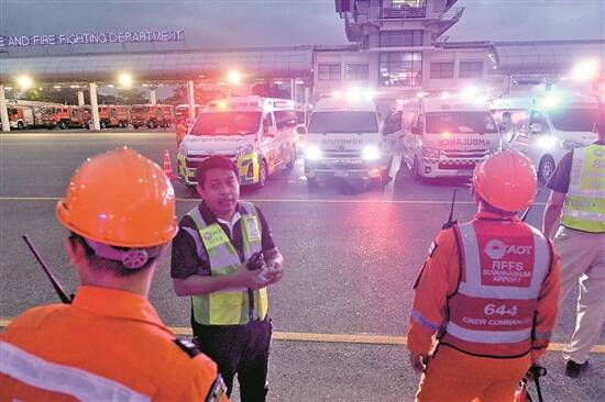 应急人员聚集在泰国曼谷素万那普机场外 新华社发