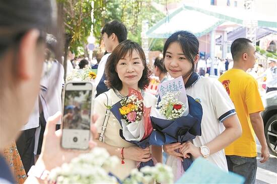 家长为考生送上鲜花,合影留念 羊城晚报记者 梁喻 摄