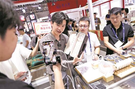 在展厅设置的直播卖货区域,主播阿彩面对手机,手捧五颜六色的黄金手串进行直播。在“水贝黄金小公主”的直播间里,数千名网友正通过屏幕挑选心仪的黄金饰品,文博会正在激发年轻人旺盛的消费力。“因为文博会自带流量,我们直播间的人数比平日直播多了好几倍,成交量也噌噌上涨。”主播阿彩介绍。