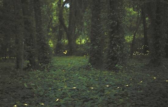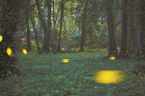 当夕阳将天边最后一抹晚霞燃尽,夜晚的幕布便从地平线缓缓拉起,等到眼睛渐渐熟悉黑暗时,隐约可以看到藏在这片深林园中,潜伏着的勃勃生机。夜蛾脱蛹,夏蝉深鸣,叶莺归栖。花狭口蛙周游于草窠石缝,草丛中萤火虫飞舞,发出一束束晶莹剔透的流光,点缀出夜晚的灿然与灵动。