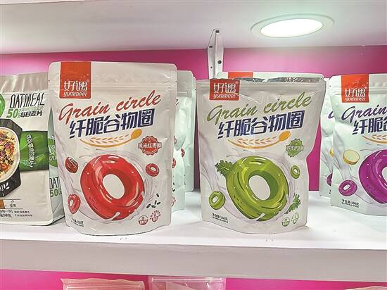 在揭阳好遇食品的展位上,记者见到许多采购商正在咨询几款包装上印着蔬果的产品。展位工作人员向记者介绍,这是该企业研发的运用了红枣、羽衣甘蓝等蔬菜、水果制成的谷物圈,更加健康。