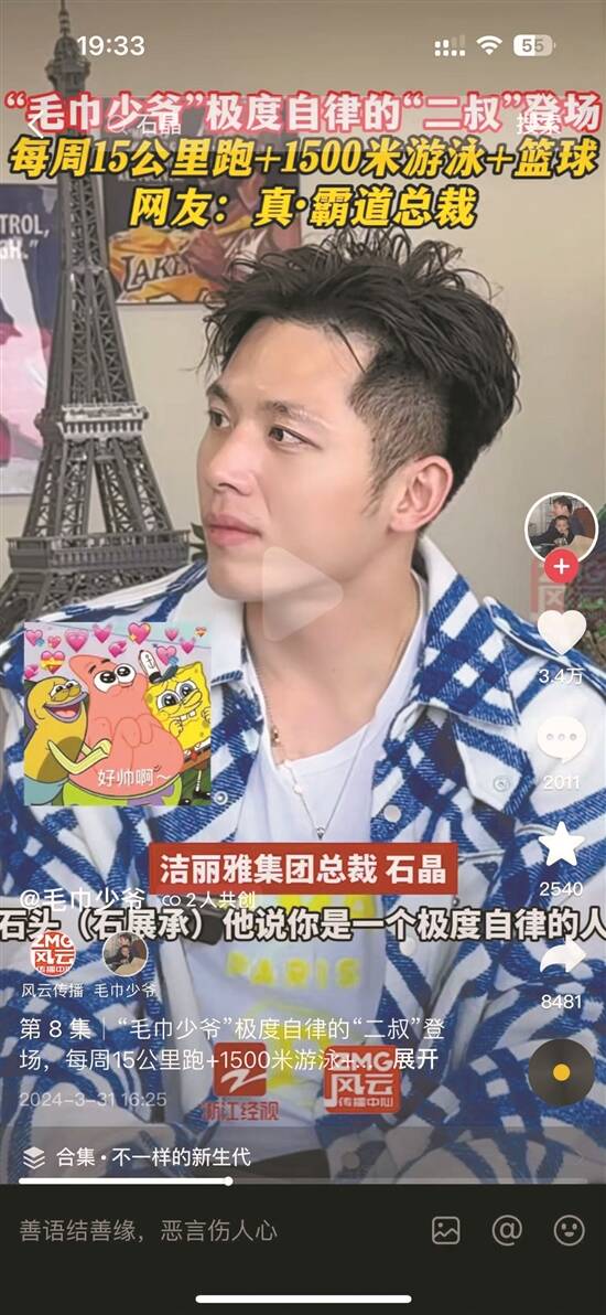 在这条抖音的评论区,一条高赞评论是呼唤二叔能够出演一集《毛巾帝国》,用八块腹肌为洁丽雅毛巾代言。在石展承的“走红”路上,绕不开的话题就是自己的海归小叔——石晶。