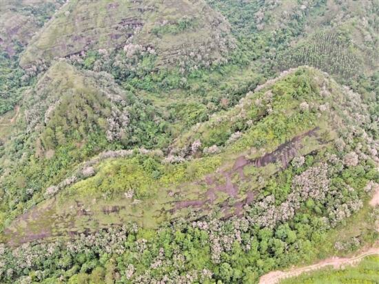 羊城晚报讯 记者欧阳志强、通讯员始宣摄影报道:近日,韶关始兴县林业局工作人员在马市镇山口水库旁巡山时被绿色山林中成片盛开的紫红色花海吸引,后经中国科学院华南植物园研究员陈红锋鉴定,该物种为国家二级重点保护野生植物丹霞梧桐。5-6月正值丹霞梧桐盛花季,绚丽的紫色“烟霞”在山林中尤为突出。