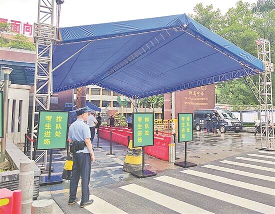 记者在华附考点了解到,今年该考点共设有41个考场,包括33个正式考场和8个备用考场。为确保考生顺利进入考场,学校正门左侧设置了考生进场处,并在此处搭建了雨棚,以应对随时可能出现的降雨。同时,学校还设置了考生身份证明补办绿色通道,为那些忘记或丢失身份证的考生提供快速补办身份证明服务。
