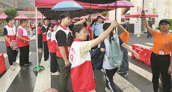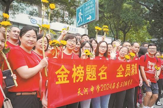 2024年高考首日,广州天河中学(珠江新城高中部)老师们拉着写有“金榜题名”的横幅祝考生们取得好成绩 羊城晚报记者 贺全胜 摄