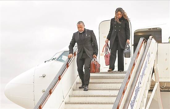 6月9日马拉维副总统奇利马(左)乘飞机抵达利隆圭 新华社发