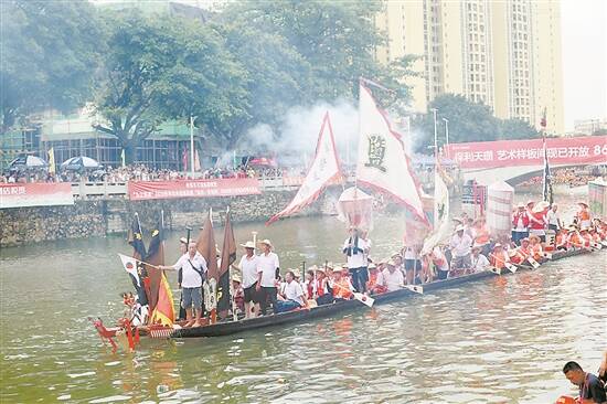 羊城晚报讯 记者张闻、王泽宝,通讯员袁迪摄影报道:在广州、佛山两地,每年端午节都有一个“龙船探亲”的习俗。端午这天,佛山盐步的村民会划着老龙舟去广州荔湾,与泮塘的龙舟相见,两条龙舟一起游船庆端午。到五月初六,泮塘的村民再划着老龙舟到盐步回访。6月11日,端午节后首日,广州泮塘长龙浩浩荡荡驶向南海盐步“回访”,双龙共同举办游龙仪式,向世界展现两条龙舟数百年的“父子情”。