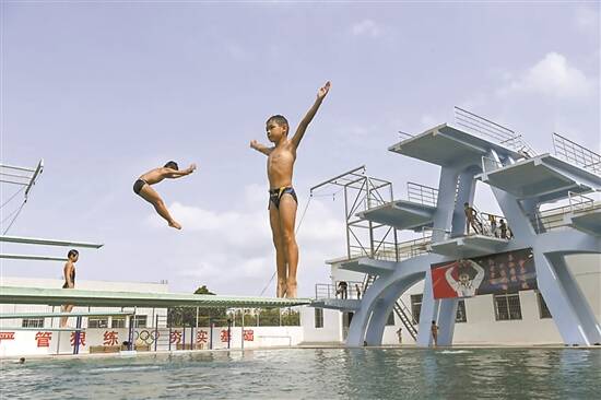 3米、5米、7米和10米高的跳台横跨天际,一群年龄从8岁到14岁的“娃娃兵团”,在教练员的指导下,勇敢地站在跳板上,腾空跃起,在空中翻转腾挪轻巧的身姿后,迅速坠入水中,如鱼翔底,出色地完成了一套跳水动作。