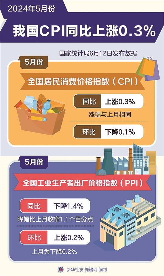 国家统计局12日发布数据,5月份,全国居民消费价格指数(CPI)同比上涨0.3%,涨幅与上月相同,环比下降0.1%;全国工业生产者出厂价格指数(PPI)同比降幅比上月收窄1.1个百分点,环比上涨0.2%。国内物价持续平稳运行。