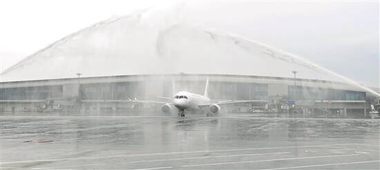 14日,执飞MU5309航班的C919客机降落在广州白云机场后,接受民航最高礼仪“水门仪式”迎接