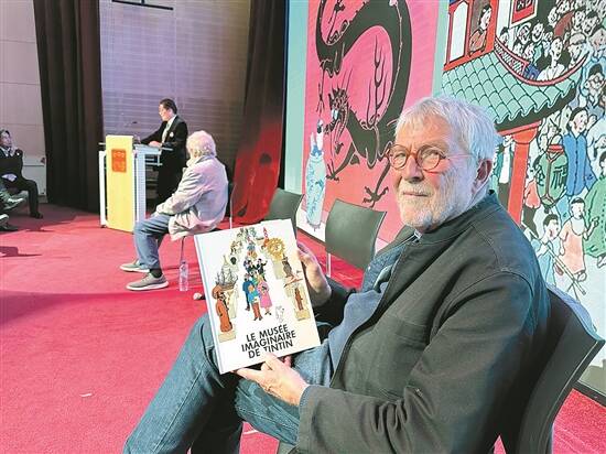 布鲁塞尔皇家美术学院前院长米歇尔展示他策划的埃尔热先生在世时最后一场“丁丁历险记”展览图册 主办方供图