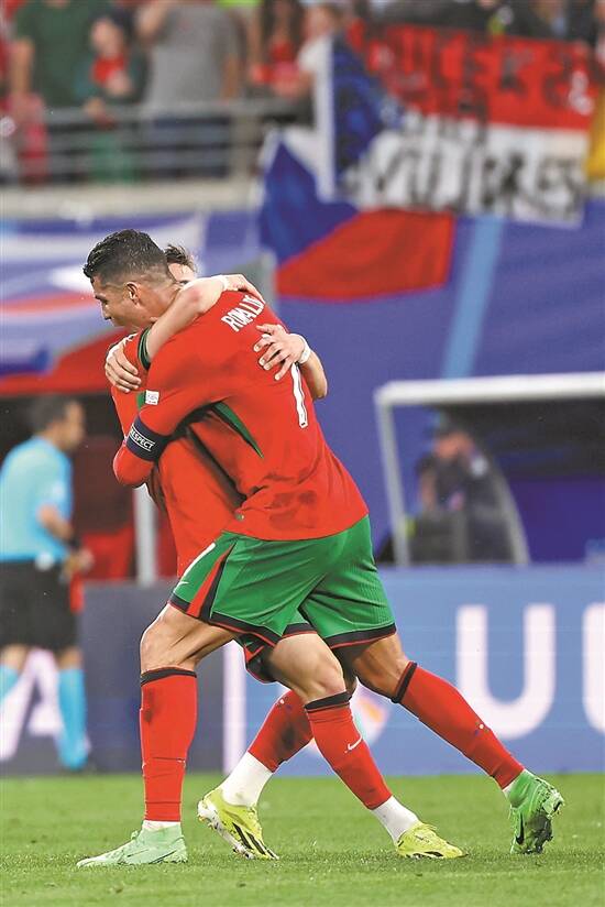 C罗(右)拥抱队友小孔塞桑 新华社发