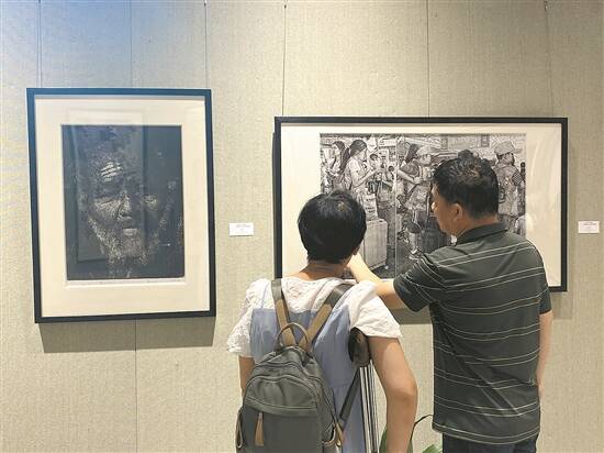 “你看老师的这幅作品是用亚克力板刻的,我的作品是木板刻的。亚克力板是胶板,非常硬,刻起来难度比木板多三分之二,我刻过几次,感觉手特别疼。你看老师刻得就非常细致生动,这些线条很美。”在作品前,唐巧萍细致地向记者介绍。在她心中,阳军是一位德艺双馨的老师,教给她很多绘画专业知识,也教会她许多人生道理。