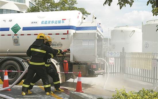 羊城晚报讯 记者吴珊、通讯员穗市监摄影报道:危险的发生往往就在一瞬间,以“演练”筑牢防线必不可少。6月20日,一场关乎生命的应急演练在广州医科大学附属第三医院(黄埔院区)举行,演练模拟了液氧储罐根部管道破损泄漏的紧急情况下救援处置的全过程。