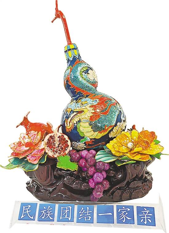 具体来看,福禄葫芦容纳万象,包容一切,寓意民族融合一家亲。“千子同一”石榴果籽粒粒饱满,颗颗相抱,恰如中华民族大家庭紧密团结在一起,形象贴切、寓意深刻,饱含期望、意境深远。一串多果的葡萄象征紫气东来、丰收繁荣,寓意援藏30年来取得的丰硕工作成果,促进了西藏经济社会的快速发展。国花牡丹花朵娇艳,花势昌盛,寓意着各族人民在党的领导下,团结共荣,继续开创国家繁荣昌盛的美好未来。