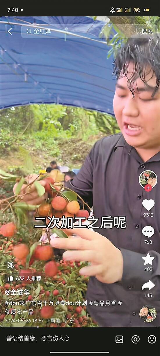 刚挂果的荔枝树,一簇簇鲜红的白糖罂荔枝,剥开后露出白嫩饱满的果肉,全进华用短视频的形式向用户呈现着荔枝的汁水与甘甜。广东6月雨水不断,在最近的一条短视频里,他在雨中向大家介绍茂名荔枝是如何从树上摘下后进行分拣、二次加工后打包发货的流程,身后是满满的正在分拣荔枝的工人。