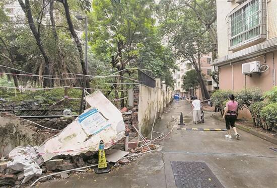 6月24日,羊城晚报记者来到丰乐苑看到,小区仅剩东侧一条单行道出入。西侧围墙有的被推倒,有的墙面被砸穿,留下形状、大小不一的洞眼。因此,西侧单行道已被简单围蔽处理。在现场,还有两名城管执法人员在值班。
