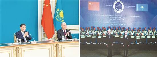 当地时间7月3日中午,国家主席习近平同哈萨克斯坦总统托卡耶夫在阿斯塔纳总统府以视频方式共同出席中欧跨里海直达快运开通仪式(拼版照片) 新华社发