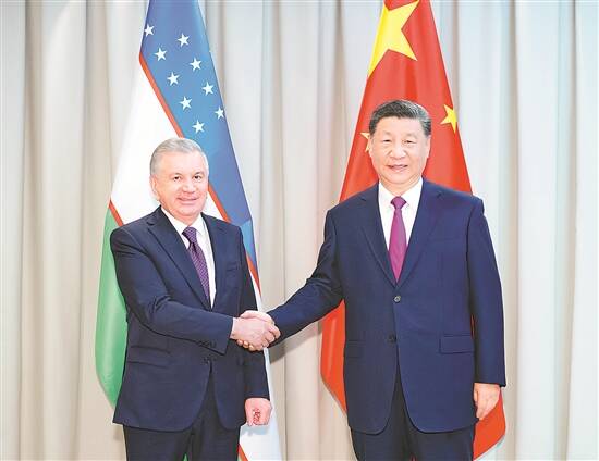 习近平指出,今年1月,你对中国成功进行国事访问,我们一致决定将中乌关系提升为新时代全天候全面战略伙伴关系,在更高起点上构建中乌命运共同体,两国关系发展进入了新阶段。今年是中华人民共和国成立75周年。中国正在加快推进中国式现代化,乌兹别克斯坦也在全面推进“乌兹别克斯坦-2030”战略。我们的目标很宏伟,也很朴素,就是让人民过上更好的日子。中方愿同乌方一道,以国家命运为怀、以人民福祉为念,推动中乌关系高质量发展。