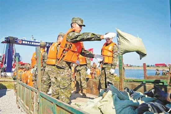 7月6日,武警湖南总队官兵在湖南省岳阳市华容县团洲垸受灾现场第二道防线搬运沙袋加固堤坝 新华社发
