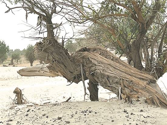 那是些什么样的树?有的像微缩版的恐龙,尾入地,身微弓,头略仰,一腿支地,一臂平抬。但无哀伤之情状,目光中似传递信念,咧开的嘴巴甚至有一丝笑容。身体却“四分五裂”,到处豁口,背部更如河床一般洞开。我轻轻地触摸,木头发出了轻微的“嚓嚓”声,随即有木屑迎风而落。这样一棵“风烛残年”之树,究竟何时出生,活了多久?我非专业人士,无心也无力考证。但它没有死,尾翼之上生出几个枝丫,主干粗壮,像有力的手臂伸向天空,枝头绿叶密集,随风飒飒作响。头顶也冒出一枝,如牛之犄角倔强地扩张,并与尾翼勾连,形成一方难得的绿荫。有的像独臂将军,孤零零地伫立,树身已呈皲裂状,全身的树皮颤颤巍巍、似悬非悬,只需轻轻一揪,就会脱落。但它依然没有死,头颈之处生出枝丫,虽无一丝绿叶与新芽,但其呈现之状如凌云健笔,意气纵横,韧劲十足。有的树干已完全干枯,“千疮百孔”,四面漏风,想必定死无疑。但靠近树洞处查看,惊讶地发现,里面竟生着一两枝细细的茎,茎上生着两三片嫩绿的叶,叶上覆着薄薄的黄黄的骆驼毛。