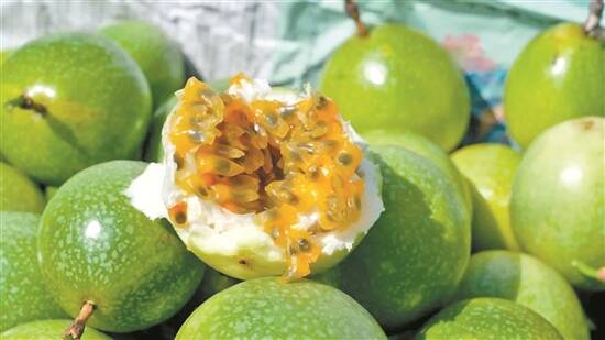 来到基地里,映入眼帘的是一望无际的百香果苗,以及村民采摘百香果忙碌的身影。基地负责人吴业庆忙着将一筐筐百香果搬上三轮车,他告诉记者,该基地共种植优质百香果600余亩。该品种被誉为百香果界的“新贵”,果肉饱满,味道鲜甜,深受市场欢迎。