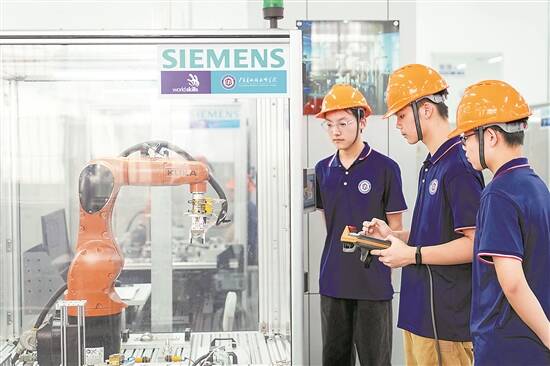 在广东省机械技师学院的中德西门子技术(中国)国际学院,学生们进行工业机器人实训 羊城晚报记者 梁喻 摄
