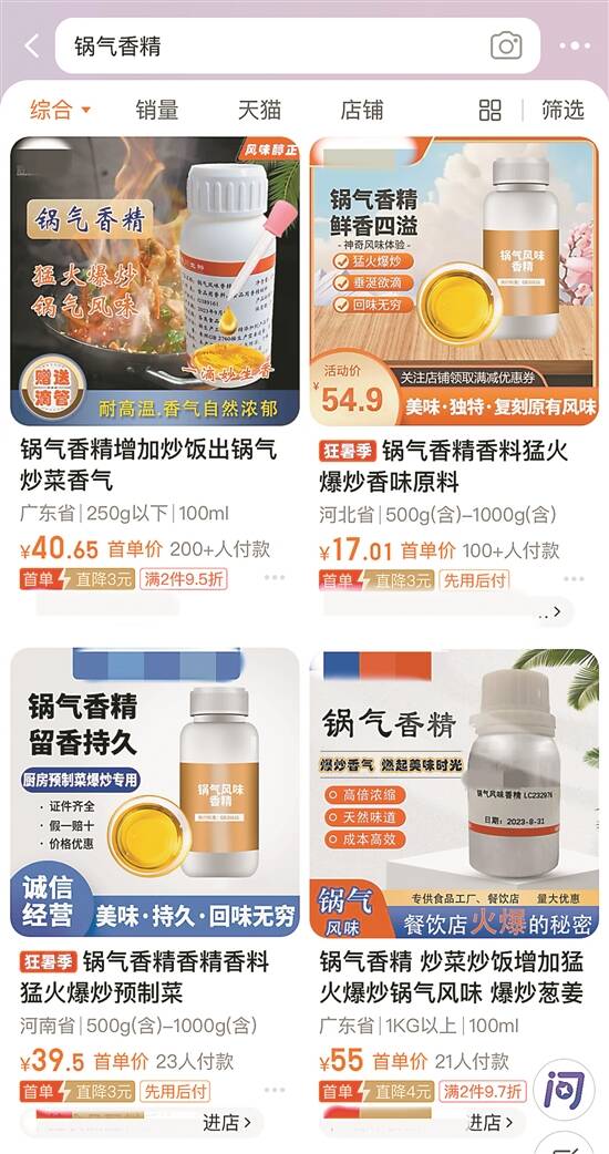 “厨房爆炒专用”“留香持久”“香气自然浓郁”……在电商平台搜索关键词“锅气香精”,不少店家在用上述宣传语销售这类产品。根据商品介绍,锅气香精可以用于火锅、麻辣烫、肉制品、预制菜及快餐炒菜等,推荐用量为每千克添加1-3克,使炒菜具有一种特殊复合型的鲜香味道。