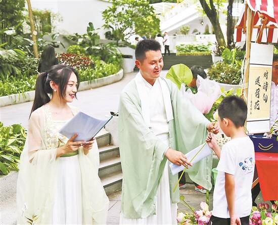 从越秀公园东门行至城市公园展览馆内,公园以莲花为元素打造了主题展,展出了数处花艺景观,不少市民游客聚集在此打卡拍照、赏莲之美、品“廉”之清:东秀舞台的“莲”文化市集上,市民游客正品尝莲花茶、莲花糕点,感受着氛围满满的“廉洁文化”;活动现场,街坊和小学生现场挥毫,写下廉洁感悟。