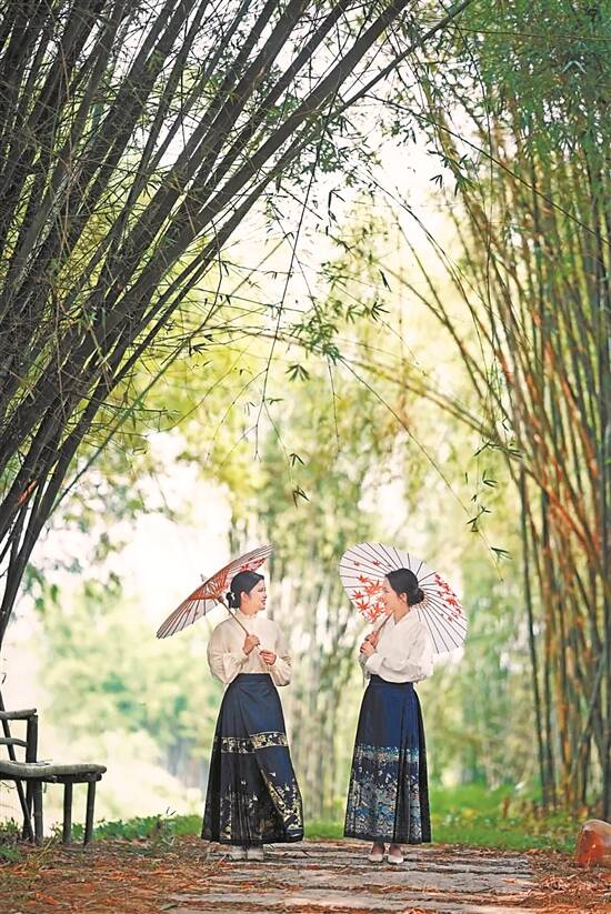 夏天的风,伴随着蝉虫的吟唱,高低起伏地跃过稻浪。少女穿上马面裙,撑着一把清雅的油纸伞,行过“深湾陂”,穿过“知竹林”。俏皮的风时不时曳起少女细长的裙带,明媚的日光透射过竹林的葱郁,在金丝纹案的裙面上勾勒出斑驳的光影。