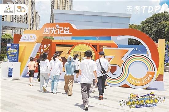 现场最吸引眼球的莫过于体彩30周年“时光记益”主题展区。夺目的色彩、丰富的展示内容、有趣好玩的互动游戏和主题打卡区,带领参与者回顾了体彩全国统一发行30年的发展历程和公益贡献。大家纷纷领取“玩咖证”,开启一段充满乐趣和挑战的体育探索之旅,集齐印章兑换精美小礼品。