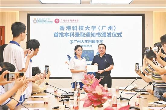 7月18日,香港科技大学(广州)今年首批录取通知书颁发仪式在广州大学附属中学举行,来自广大附中的罗浩同学成为001号录取通知书的获得者。港科大(广州)校长倪明选教授出席颁发仪式,9名广附学子成为拿到首批录取通知书的幸运儿。
