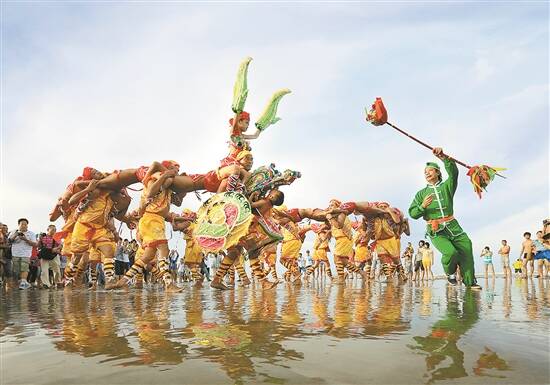 作为一种古老的传统舞蹈,人龙舞是东海岛特殊社会历史因素与地域自然条件结合的产物,是从明末清初流传至今300多年历史的民间大型广场表演艺术,其结构分为龙头、龙身和龙尾,由大人和孩童组合而成,以舞龙的方式,融入敬龙、祭海等多种风俗,祈求平安和丰收。2006年,湛江人龙舞入选首批国家级非物质文化遗产名录,被誉为“东方一绝”。