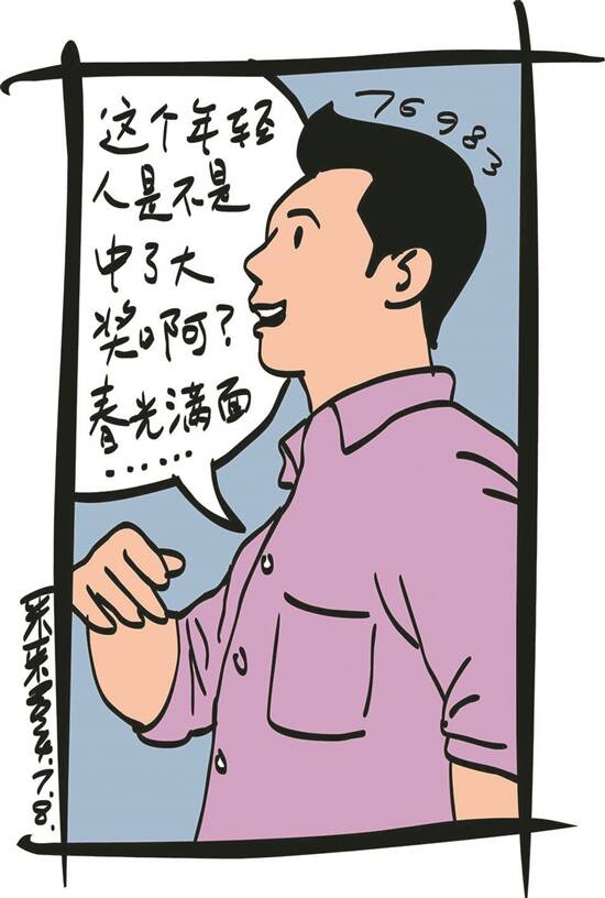 老李好奇,插话道:“这个年轻人是不是中了大奖啊?春光满面,看来运气不错。”