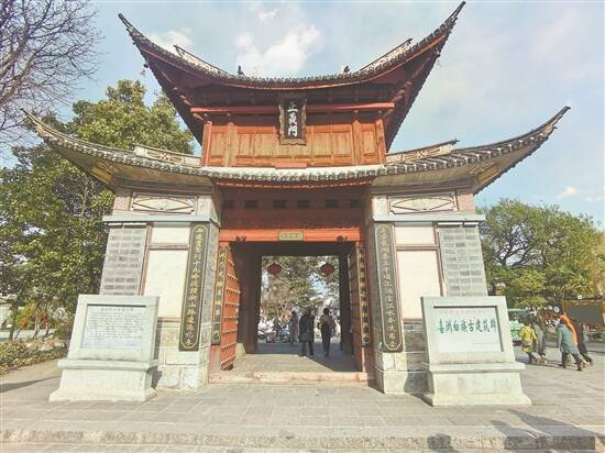 洱海边的喜洲古镇是白族文化的发源地,三面环水,如同镶嵌在洱海西岸的一颗洁白、耀眼的明珠。我走进古镇,第一眼就看见那座古朴、典雅、庄严、厚重的门楼。两层八角屋顶,木石砖瓦结构,一楼是白灰墙,二楼是红木墙。一楼通道正门两侧有两副褐底黄字的对联,外联“东鉴龙湖集三千顷汇澜沧江水奔流南去,西连灵鹫列十九峰纵横断山脉逶迤北来”,内联“斯为叶榆古郡初兴地,此乃史验名城第一门”,横批“锦绣苍洱”。二楼正面“正义门”三个红底白字则苍劲有力。细看一旁的石碑,原来这里在唐宋时曾为大理国重要城邑,明清时乃是滇西重镇,所以这里的古建筑吸收了西方和江南民居艺术特色,形成非常独特的建筑风格,也具有重要的历史、科学、艺术价值。